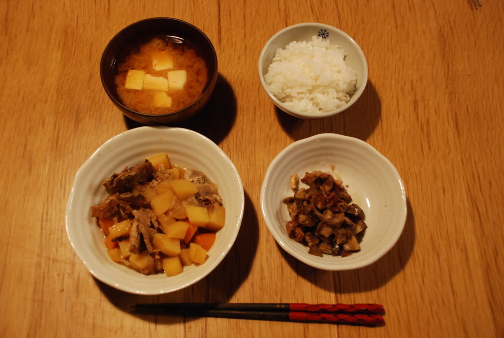 更新日: 2022-10-042022-09-15cuisine repas Le repas de ce soir: Ragoüt de viande aux pomme de terre 白米 ・・・du riz肉じゃが ・・・ragoüt de viande aux pomme de terre茄子の煮浸し ・・・aubergine poché豆腐の味噌汁 ・・・soupe de miso avec des Tofu